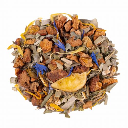 Zutaten: Apfel, Olivenblätter, Banane (Banane, Kokosöl, Rohrzucker, Honig), Orangenschalen (7%), natürliches Orangen Aroma, natürliches Aroma, Mango (2%), Ringelblumen, Kornblumen blau. Natürlich aromatisierte Premium-Tee-Mischung mit Zutaten aus nachhaltigem Anbau.