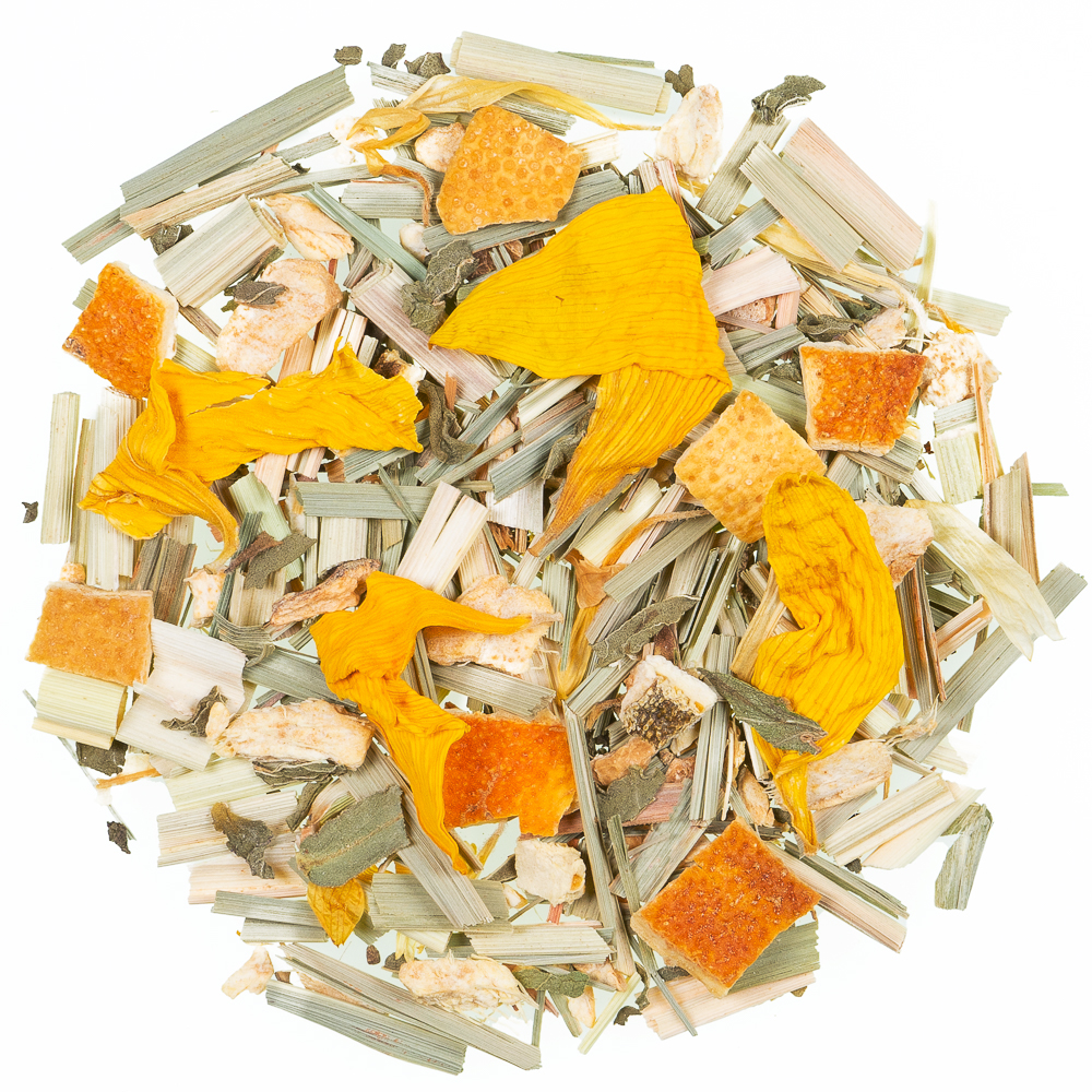 Zutaten: Lemongras*, Ingwerstücke*, Zitronenschalen*, Orangenschalen*, Süßholzwurzel*, Pfefferminzblätter*, Sonnenblumenblüten*