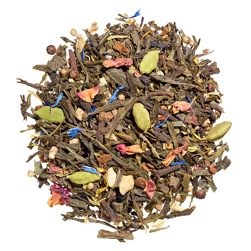 Aromatisierter Grüner Tee mit Gewürzmischung und Mango-Zitrusgeschmack.